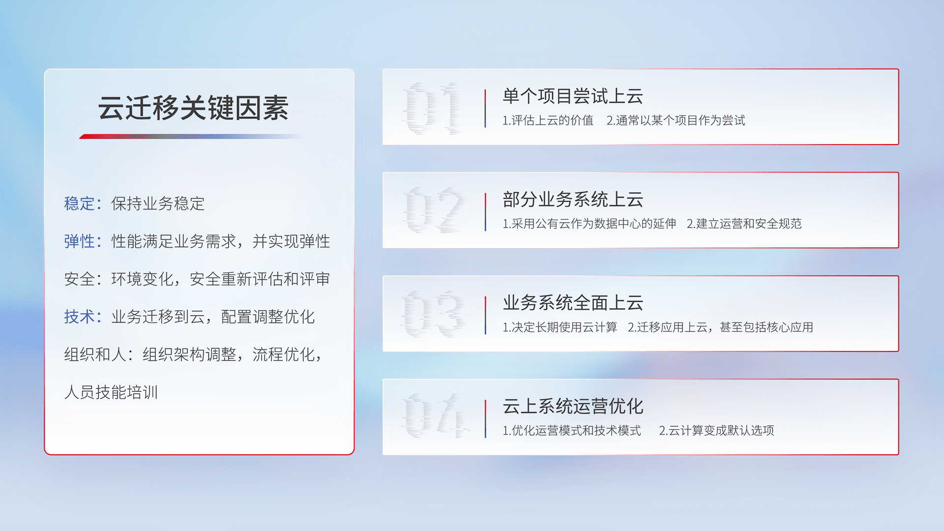 结合实际业务,,,从规划设计、、云平台选型、、、云原生改造、、、数据迁移、、集成交付,,,,迁移全过程为客户识别最佳上云路径,,做好风险识别管理,,,,设计网络架构、、、身份权限、、、、安全审计合规、、、、操作审计、、日志审计、、监控告警策略、、、、多站点容灾设计等,,,,对云上基础设施进行整体规划,,,提升IT治理水平,,,,以满足弹性、、、、高可用、、、高性能的需求。。。。